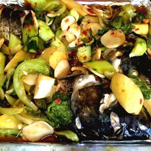烤箱烤鱼时,准备蔬菜等洗净。刚才的油锅烧热,可再加点油,放入郫县豆瓣,蔬菜,豆腐,年糕,土豆等。翻炒后加入水300克左右,入蚝油,煮至7分熟。出锅,均匀的铺在烤好的鱼上面,继续入烤箱165度,8分钟。