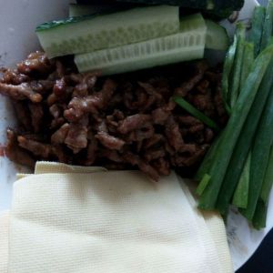 豆腐皮切成正方块,大小自己随意!葱切段,黄瓜切成条