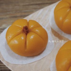 把揉圆的面团稍稍压扁一点,用牙签在在上面压出南瓜纹路,在顶部放上枸杞做瓜蒂