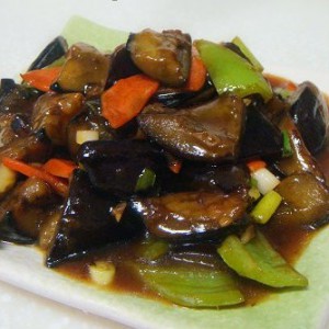放入煎好的茄子和胡萝卜片、青椒片翻炒至汤汁收浓,撒上葱花出锅。