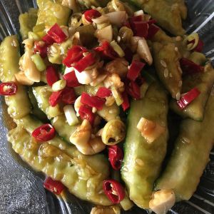 用刀拍黄瓜,至小块。放容器内,加盐、蒜蓉、辣椒、葱花、生抽、陈醋拌匀。