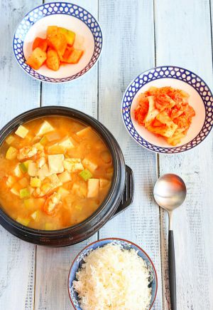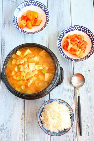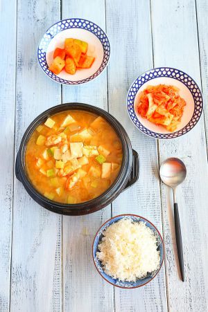 盛上一碗米饭,摆上几样泡菜,一份很正宗的韩国大酱汤完成啦!