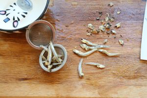 小鱼干去头和内脏,放在纱布袋里,或者像我这样放在调料盒里。