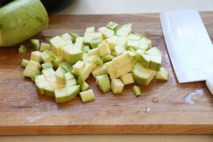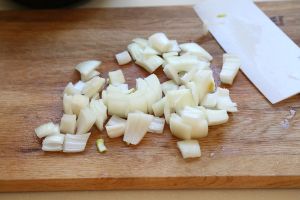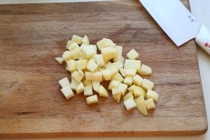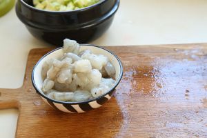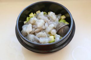 把土豆、洋葱、西葫芦、虾和鱼干一起放入大碗中。