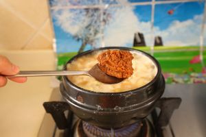 加水煮开,撇去浮沫,放入大酱拌匀,煮10分钟。