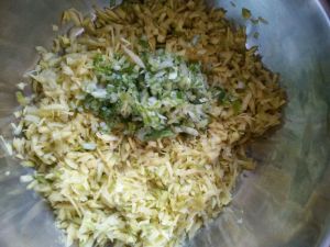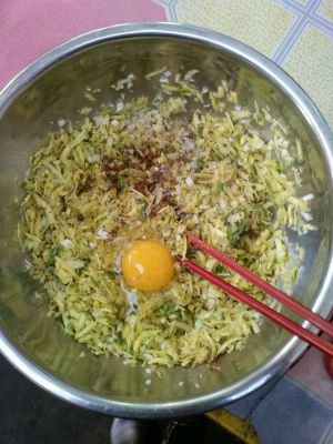然后把胡椒粉,花椒粉,鸡蛋,面粉,淀粉,适量盐,葱姜都放进去,进行搅拌,如果太干,可以少量点一点水,我面粉放了5汤匙,淀粉放了1.5汤匙,馅能粘住就行,面粉放太多,丸子不软