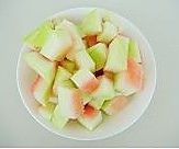 西瓜皮洗净,去掉绿皮,贴近瓜皮处的瓜肉留少许,切成小块。