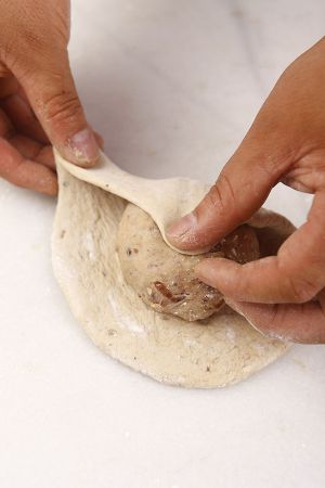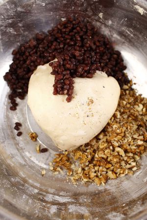 将面团取出一半和核桃碎,红豆粒搅拌均匀。