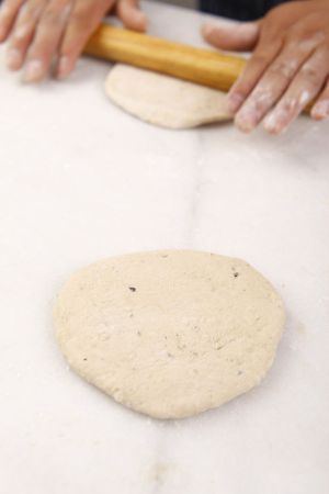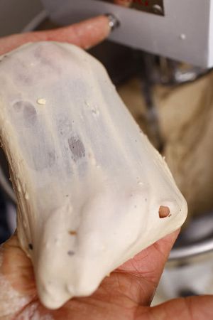 将干性材料和湿性材料搅拌至表面光滑有弹性加入黄油搅拌至面团能拉开面膜即可。