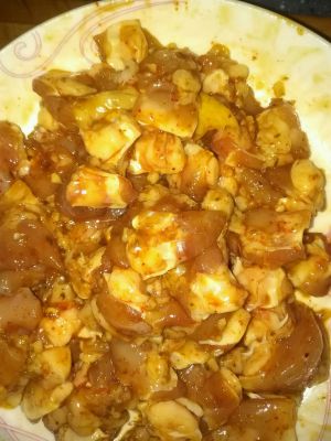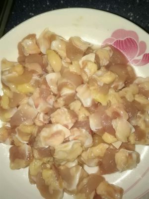 腌制:耗油一勺,老抽一勺,盐适量,味精适量,胡椒粉少量,孜然适量,辣面适量,姜片,葱末,抓匀入味,腌制30分钟