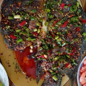 然后均匀的浇在烤鱼上,既可端盘上桌。