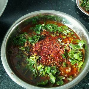 倒到刚才装莴笋的碗中,将花椒,辣椒粉洒上面,葱,香菜放边上