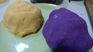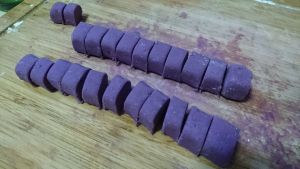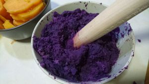 将紫薯剁成泥,哈哈哈,我是用擀面杖剁的