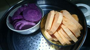 放入蒸锅蒸二十分钟左右,直至红薯紫薯软烂