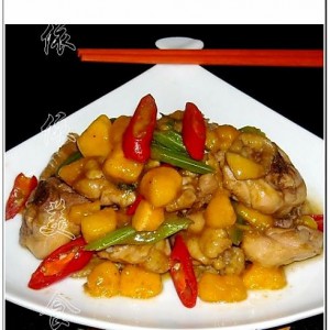 3个鸡腿斩件,用盐,生抽,白糖,生粉,料酒,姜丝腌20分钟;