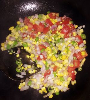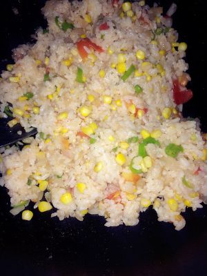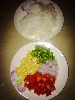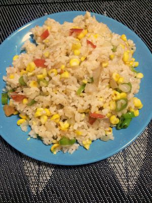 米饭一大盘备好.把玉米剥粒.青椒.西红柿.洋葱切丁