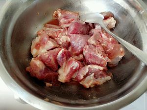 将排骨用清水洗净。放在碗里,加入适量生抽,盐,鸡精,料酒和淀粉,拌匀,腌制30分钟。