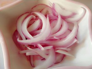 把洋葱切成丝,蒜切片,青椒切片,干辣椒切成小段备用。