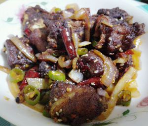 在锅里加入适量的油,油温起来之后放入洋葱,蒜,青椒,辣椒,炒出香味的时候加入一勺郫县豆瓣,豆瓣炒熟的时候,加入事先炸好的排骨,最后加入芝麻继续翻炒。