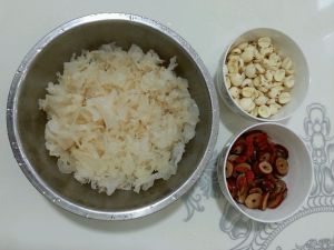 干银耳,干莲子,枸杞,干枣片泡在开水里,泡发备用。