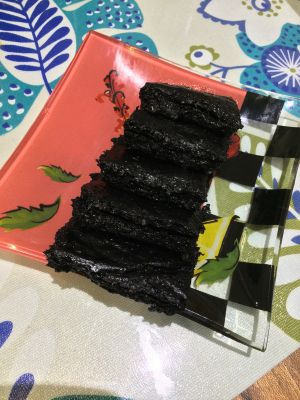 烤盘里铺上油纸,把粘稠的糊糊铺平,上下火220度30分钟。直到水分基本蒸发。