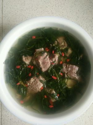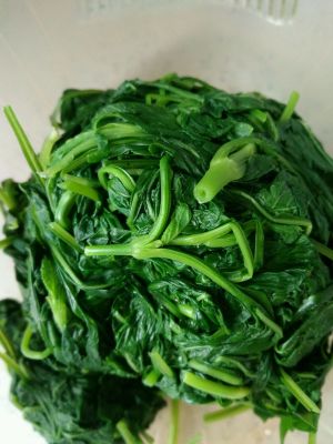 看着时间,剩最后15分钟到20分钟的时候,开锅,加入苦菜,加盐,鸡粉调味