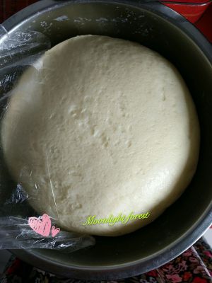 上一张发酵好的面团图片。面团发至原来的2~2.5倍大小即可。
