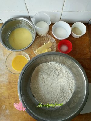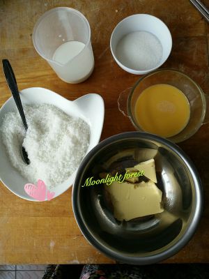 趁发面的时间来做椰蓉馅儿,(我这次做的椰蓉馅儿是翻倍的也就是16个面包的馅儿量,大家做的时候根据配方给的用量就可以)准备好所有的椰蓉馅儿材料。