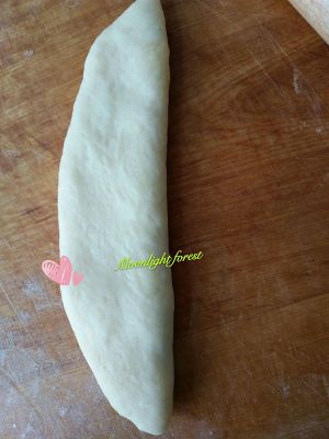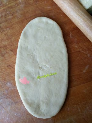取一个静置好的有馅儿面团压扁擀成牛舌状。