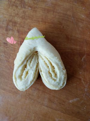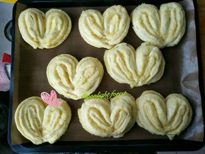 8个心形整好后放铺好油布的烤盘盖上保鲜膜,进烤箱进行第二次发酵。(38°20分钟,这个是夏天的温度,如果是冬天需要加时间。)