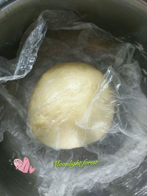 降出膜的面团揉光放盆里盖上保鲜膜,在上面再盖一个湿毛巾放一边进行第一次发酵1小时左右。