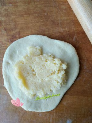 取出椰蓉馅儿,也分8份。取一个面剂子压扁擀圆皮,将馅儿放中间。