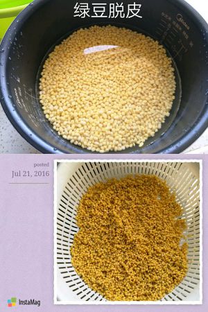 洗净脱皮绿豆,用清水泡一夜,防止天热发芽,可放入冰箱冷藏。