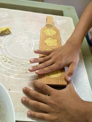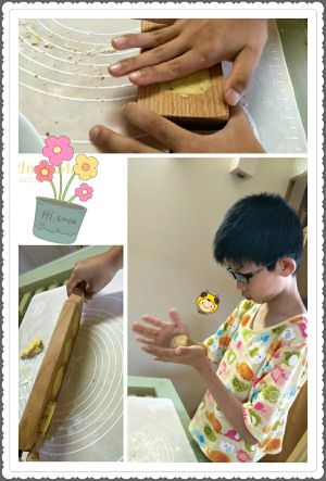 把绿豆泥分成小块,稍微沾一点炒熟的面粉揉捏后放入模具中。
