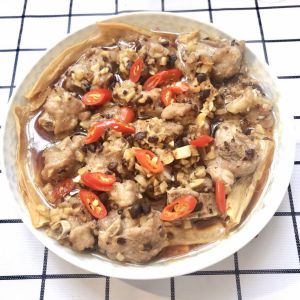 把排骨铺在腐竹上。(也可以用芋头块,依据个人口喜好,吸足排骨汁的腐竹超好吃)