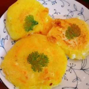 锅中烧热油,改中火煎土豆饼。每个饼上面按一枚香菜叶为装饰。一面金黄请翻面。