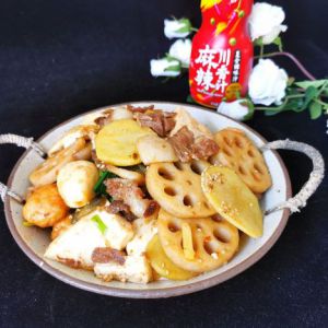 加入豆腐、鱼丸和肉丸,加豪吉川香麻辣汁翻炒均匀。