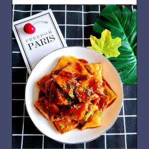 用筷子一块一块把豆腐块拣到盘子里码放整齐,浇上锅中剩余的汤汁,茄汁脆皮豆腐块就大功告成了!