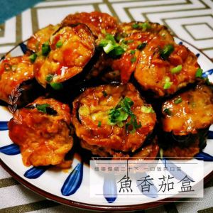 这个时候准备一个辣酱,淀粉清水食盐倒入锅中,再讲盛起来的茄盒迅速倒入锅中翻炒三十秒即可出锅啦