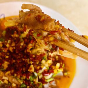 鸡腿取出稍晾一会儿,卸肉、摆盘、放上香葱末、蒜末、香菜末、花生碎、糖、醋、酱油、最最重要的是把蒸鸡腿时整出来的鸡汁淋上,最后淋上辣椒油!