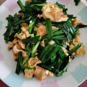 鸡蛋快成型了,放韭菜,小火,翻炒,放点盐
