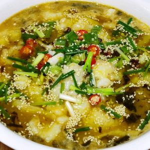 将鱼片带汤倒入装有酸菜的大碗中,放上青红椒圈,葱段,花椒油,熟芝麻。锅中倒入食用油二勺,放入花、麻椒炒出椒香,待花椒略有变色即捞出不用,将锅中热油浇在碗中葱段、熟芝麻上激出香味即可。