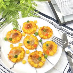 刷好了酱,就可以放上准备好的玉米胡萝卜,青豆丁。
