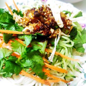 把配菜和调料放上,好吃的鸡丝凉面做好了。