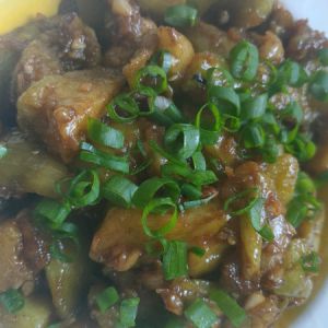 茄子去皮切块,加盐腌出水,用清水冲几遍,加淀粉裹匀