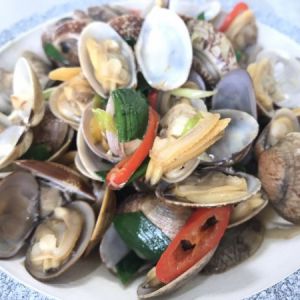 花蛤过水焯一下,葱,蒜,辣椒切好备用