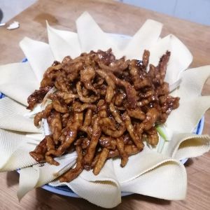 下肉丝大火翻炒酱裹上甜面酱即可,点上一点小磨香油,出锅!
