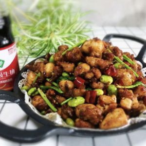 放鸡丁,继续小火翻炒2分钟,让鸡丁吸收佐料的味道,喜欢辣的,可以多放点辣椒,或者再放点辣椒粉