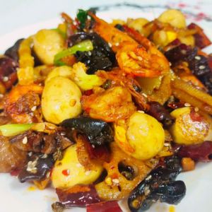 荤菜炒熟后加入素菜翻炒,起锅前加入香菜