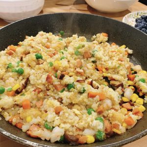 Ⅰ 先炒花菇虾仁,炒香后再加入胡萝卜,豌豆,玉米丁,火腿肠丁炒